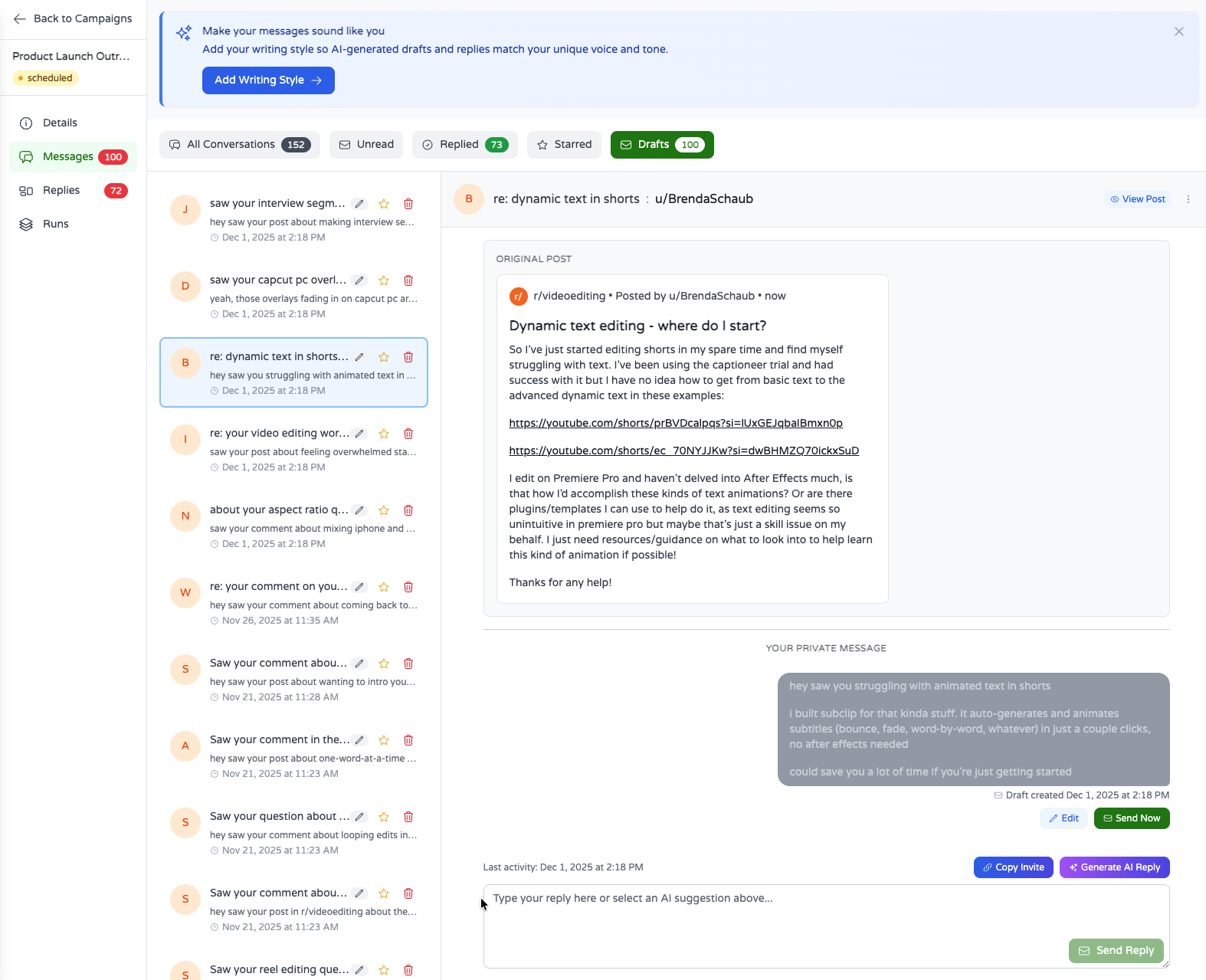 Behind the scenes, our Reddit Campaigns tool uses AI to surface high-intent posts across your target subreddits. When a relevant conversation is found, it’s queued for outreach. Now, before you finalize your message, you can see a snapshot of the exact post or comment that prompted the action. This feature is tightly integrated with the draft-for-review workflow, enabling both manual quality checks and seamless editing.